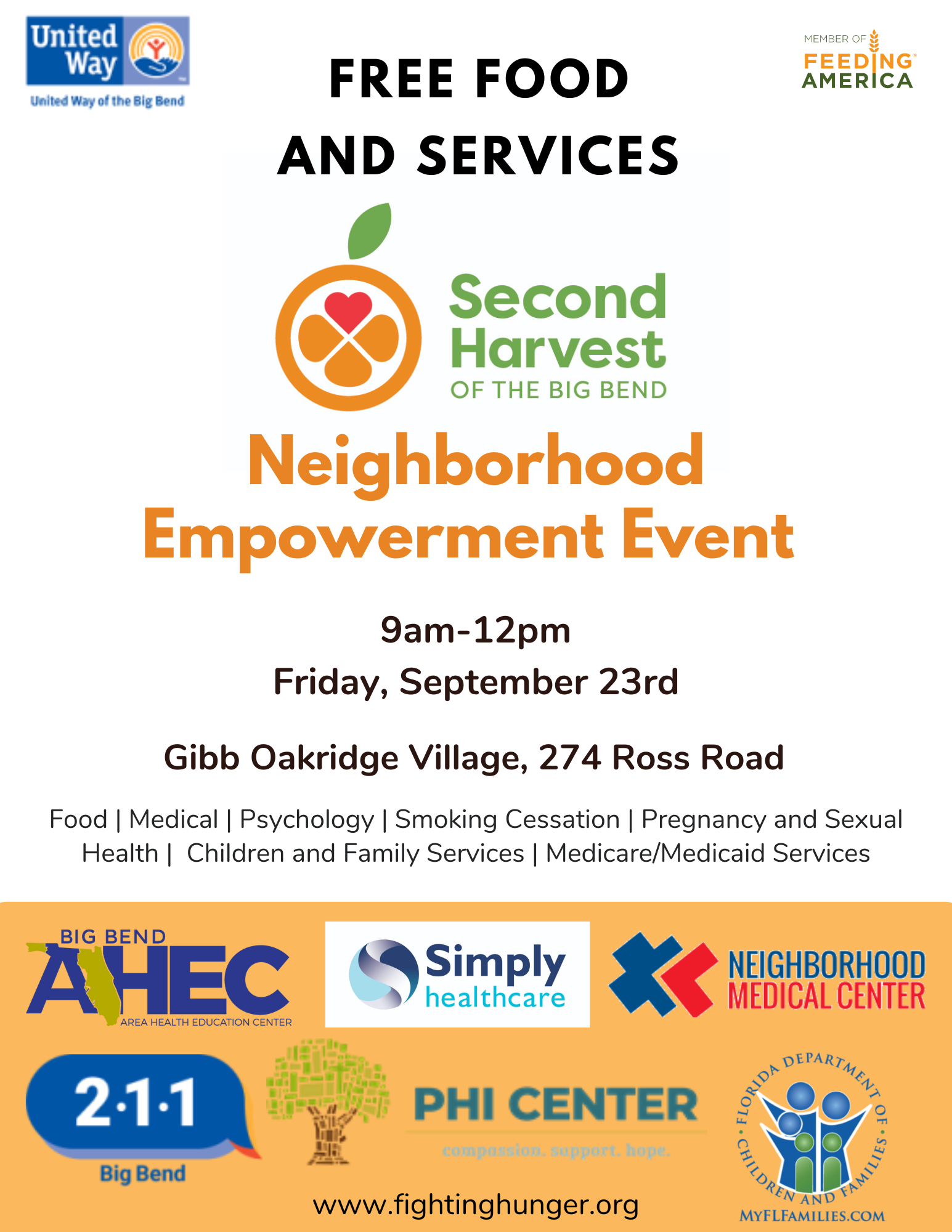 Come out on Friday, September 23rd for Second Harvest of Big Bend's Neighborhood Empowerment Event! There will be food, family services, Medicare services, and much more.