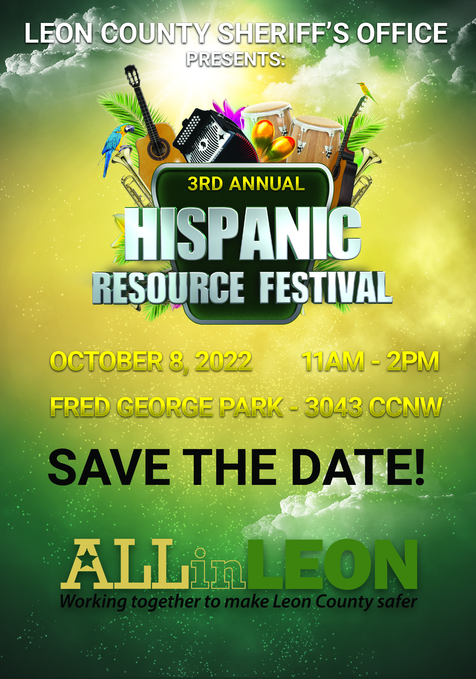 Come out and join the Leon County Sheriff’s Office's Third Annual Hispanic Resource Festival! This event will provide information on resources available to the community and work to build the relationships between the Sheriff’s Office and the Hispanic community.