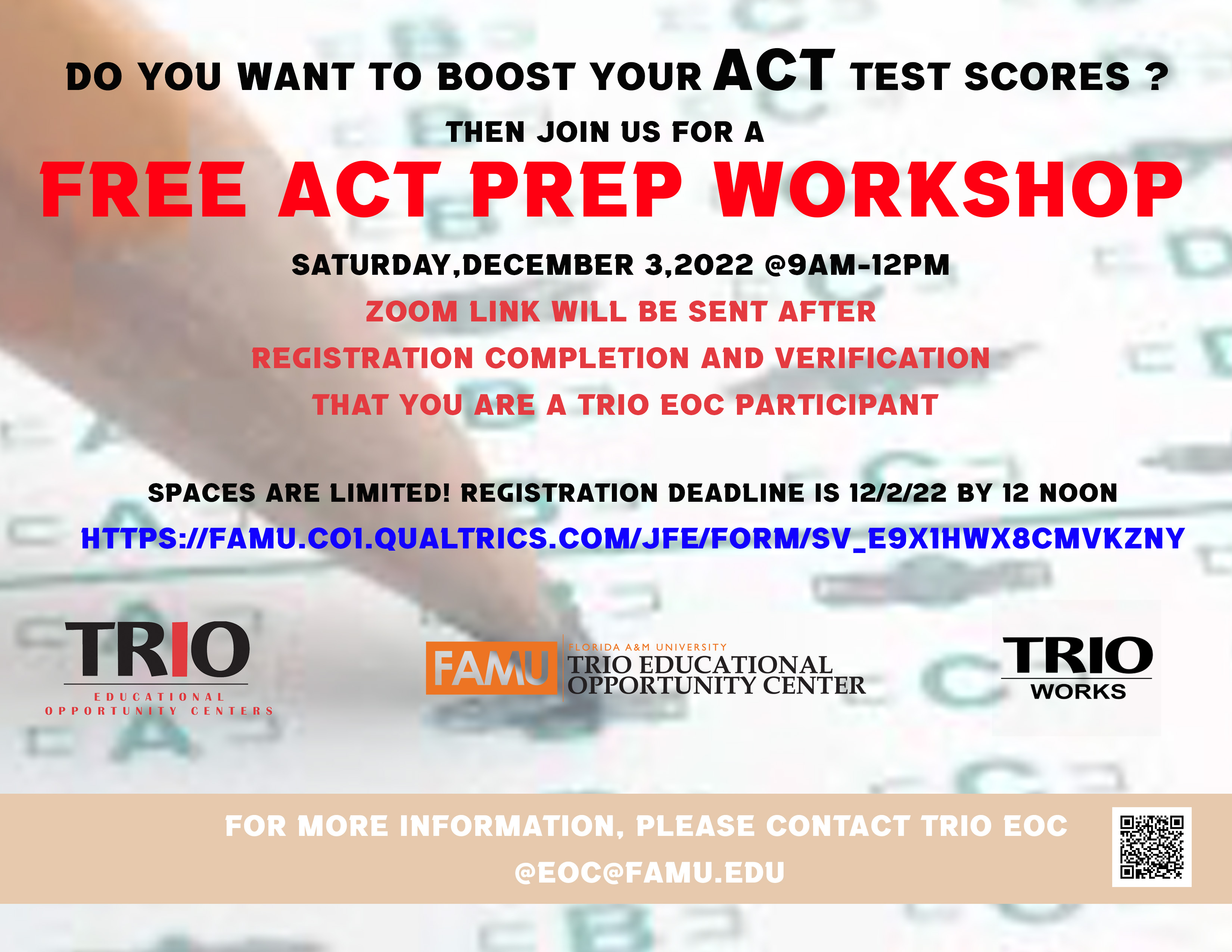 Boost your ACT scores with this free ACT prep workshop on December 3rd! Your zoom link will be sent after registration and the dealine to register is December 2 at 12 noon. Spaces are limited so sign up now!