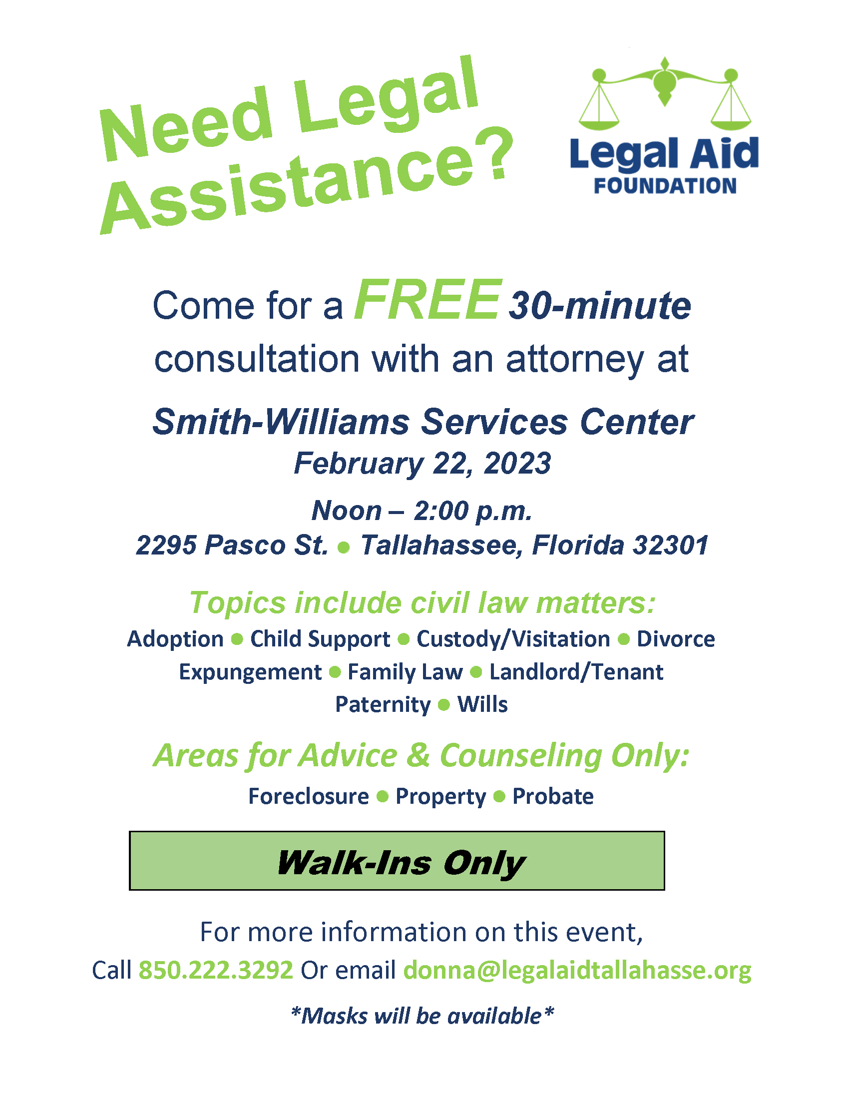 Legal Aid Foundation will offer FREE 30-minute consultations with attorneys at Smith-Williams Service Center. Topics include civil law matters such as adoption, child support, custody/visitation, divorce, expungement, family law, landlord/tenant, paternity, and wills.