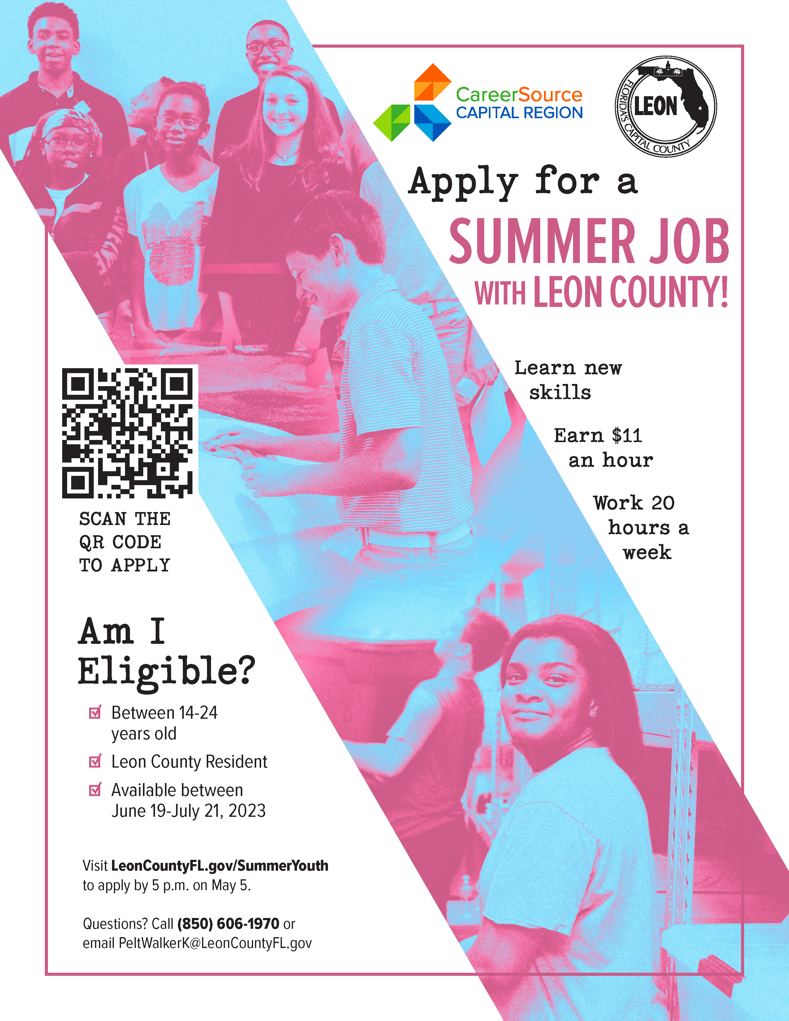 A Summer Youth training program is presented in partnership with Leon County and CareerSource Capital Region. The 5 week program provides teens and young adults, ages 14-24 years, paid internships and work experience during the summer with Leon County Government departments. The salary is $11/hour and applications are available now through 5:00pm, Friday, May 5, 2023. Click here for more information.