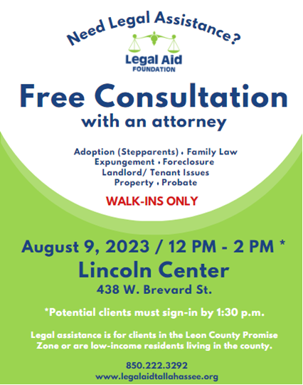 Obtain free legal advice at the Lincoln Center. Potential clients must sign-in by 1:30pm. Legal assistance is offered to those living in the Leon County Promise Zone or a low-income residence.