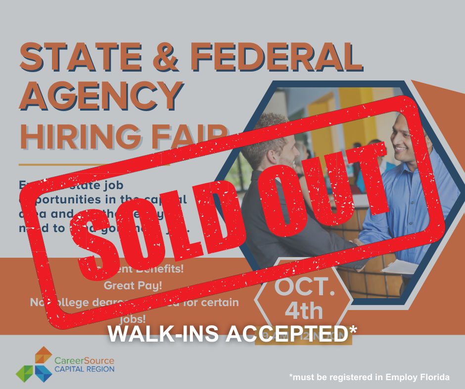 CareerSource Capital Region invites you the State & Federal Agency hiring fair! Meet with up to 20 different agencies hiring for a wide variety of positions in the capital region! No college degree required for certain jobs; degrees and certifications required for others. Excellent benefits! Great pay!