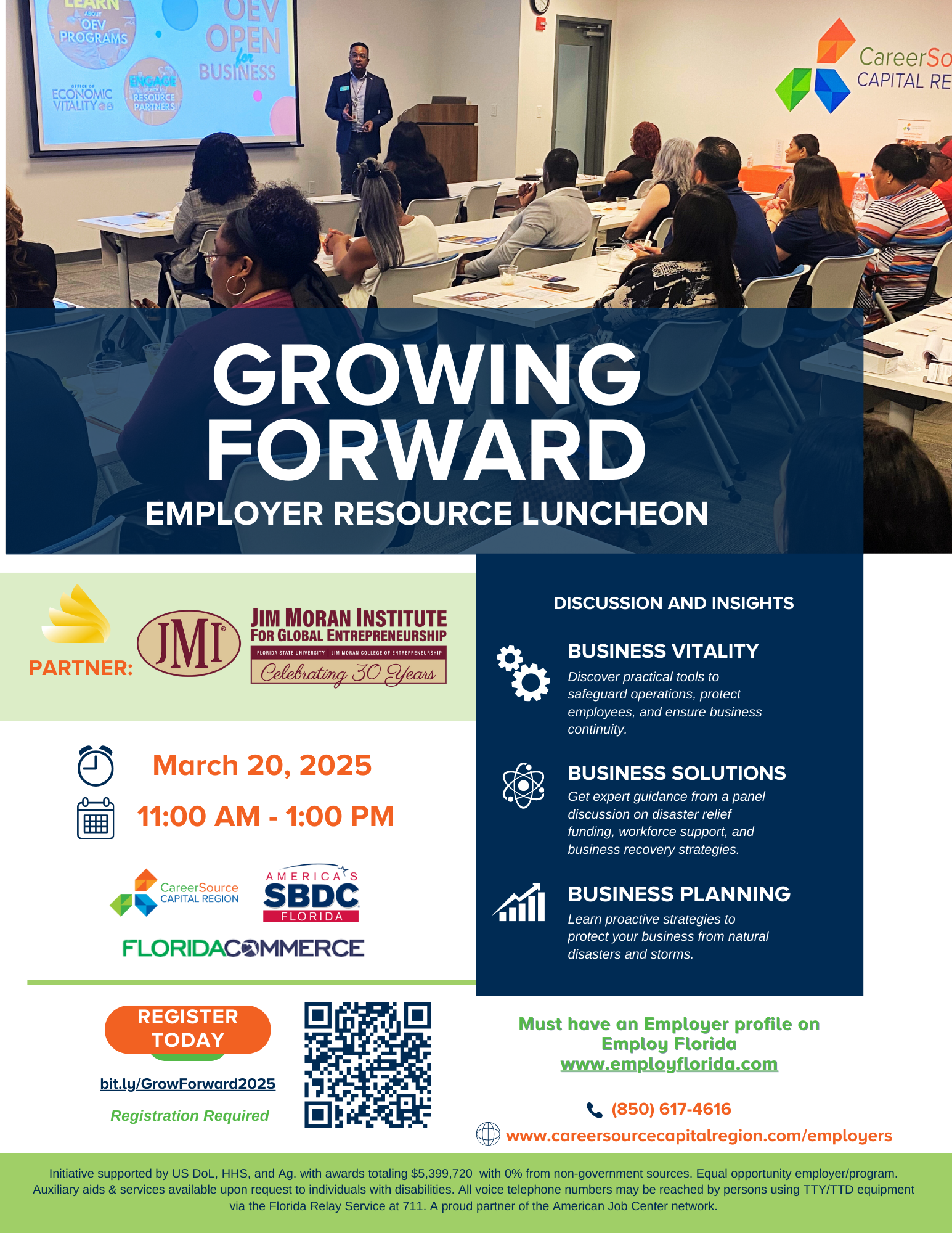 - Learn from industry experts, including representatives from the Small Business Development Center, FloridaCommerce Disaster Relief/Rebuild Florida, and CareerSource Capital Region.