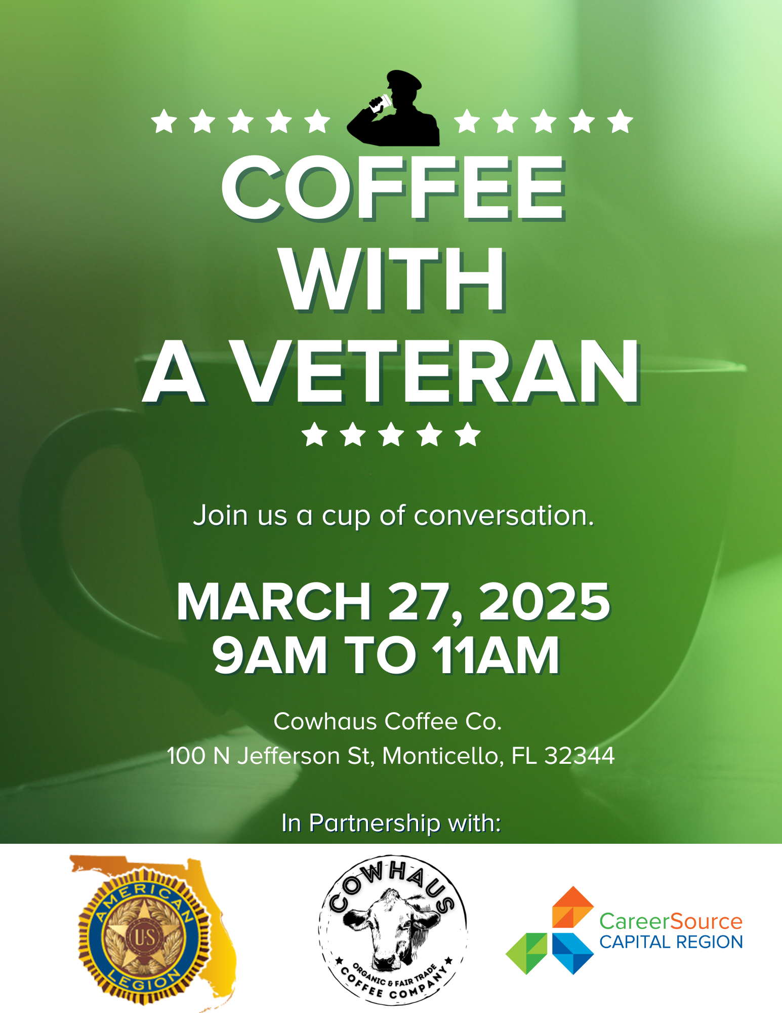 In partnership with the American Legion and Cowhaus Coffee, we have staff members at Cowhaus Coffee Company in Monticello, FL, to talk with veterans and eligible dependents about the solutions we offer, as well as various resources we can connect them with. Come enjoy a morning of conversation and coffee with fellow veterans and community organizations.