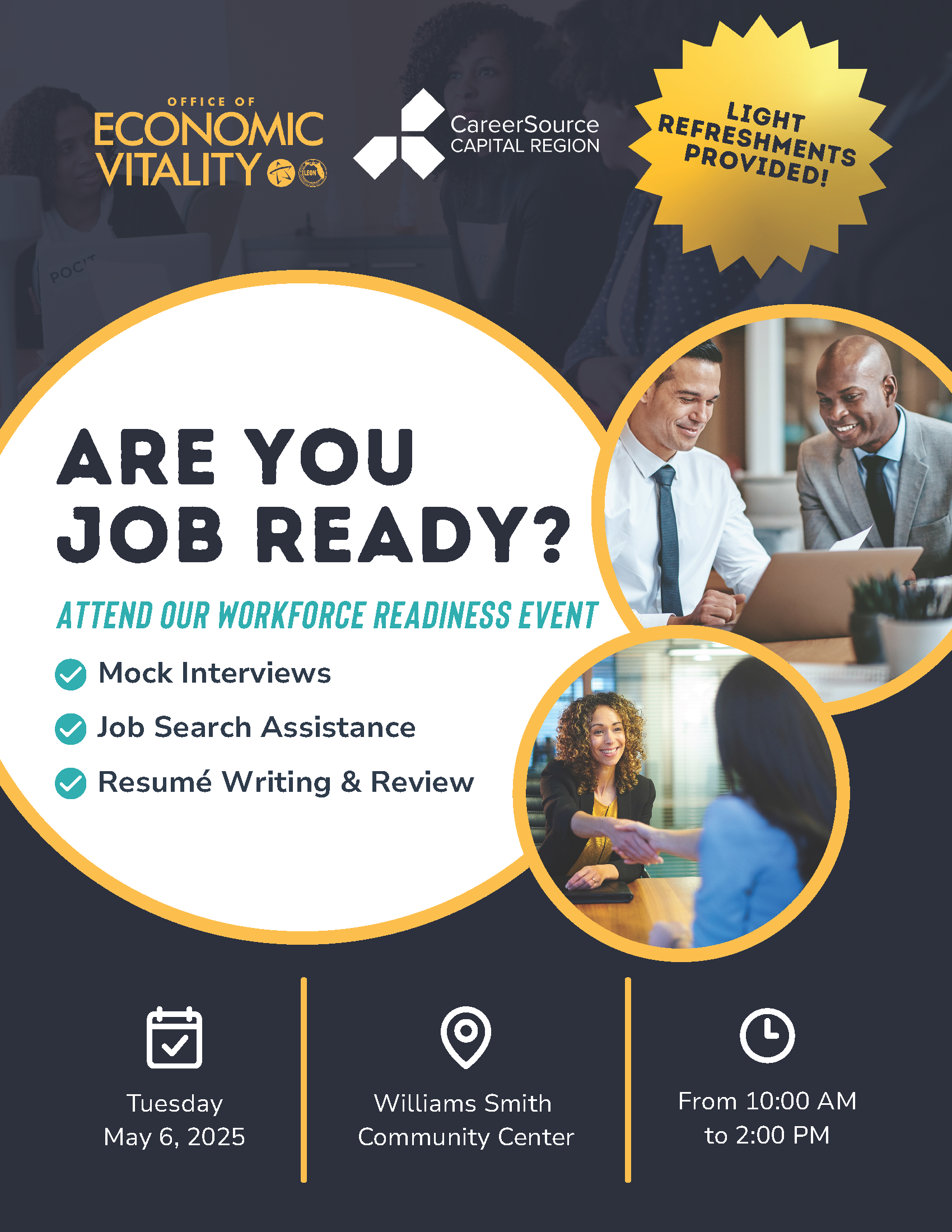 OEV has engaged CareerSource Capital Region to be onsite to help job seekers with job search assistance, resume writing and guidance, and mock interviews.