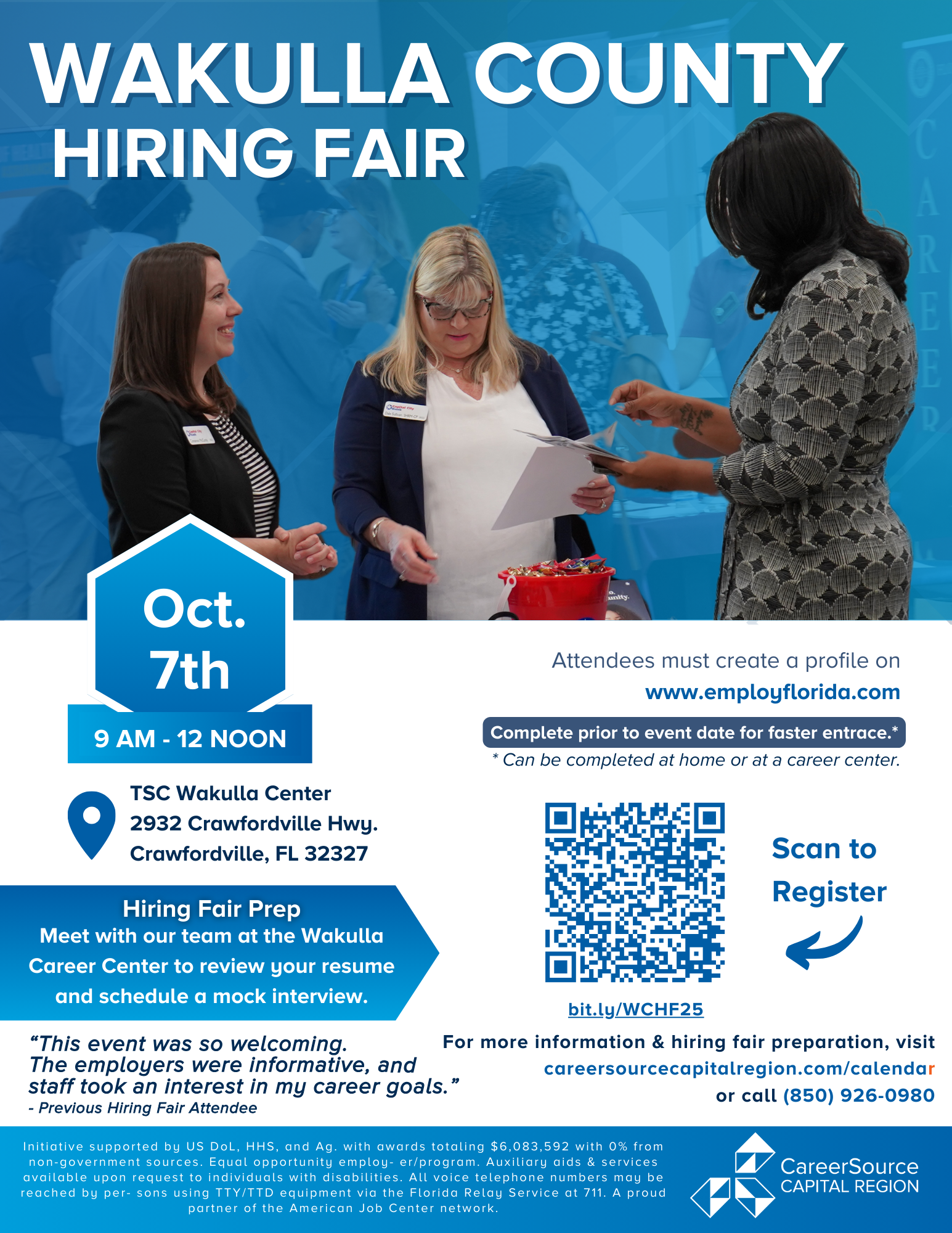 Whether you're an experienced professional looking for a change or just starting your career journey, the Wakulla County Hiring Fair has something for everyone.